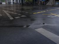 a wet street with two signs painted in yellow on it and a cross walk across the street