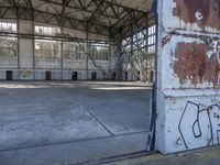 some rusty steel doors that have been painted white and brown with graffiti on them in an old warehouse
