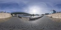a fisheye view from the bottom of the walkway that is in front of a brick wall and bridge