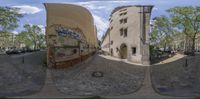 A vibrant alleyway in Berlin, Germany, featuring graffiti-covered buildings and trees. Classic architecture and cobblestone streets create a unique urban design. The street is bustling with city life, as one person rides their skateboard.