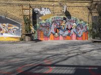 This stock photo features a brick wall with some graffiti painted on it, situated in a urban courtyard in Berlin, Germany. The vibrant artwork adds a touch of color to the classic architecture of the city. The graffiti wall stands out against the clear sky, creating a visually appealing contrast. This image captures the dynamic street art scene and urban design of Berlin's art district. The mural on the brick wall showcases the talent and creativity of the local visual arts community. With its unique blend of old and new, Berlin is a city that embraces both tradition and innovation.
