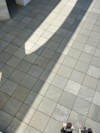 A top-down view of a modern architecture building in Berlin, Germany. The high, elevated structure casts a pattern of shadows on the beige surface below. The composite material flooring adds to the architectural appeal of this European city.