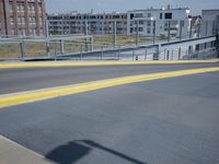 This stock photo features a stop sign standing on the edge of an empty highway in Berlin, Germany. Next to the stop sign is a modern architecture building with a yellow roof. The road is made of smooth asphalt with clear yellow lines and a guard rail on the side. The sky is clear with clouds in the background. The image captures the urban atmosphere of the city and the entrance to the highway. It can be used to illustrate concepts related to road infrastructure, city life, and modern architecture in Berlin, Europe.