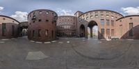 a very big pretty building with some big windows and brick walls near by and behind the water