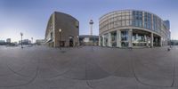 A fish-eye lens shot captures the modern architecture of Berlin, Germany. The iconic television tower stands tall in the background, while the city's vibrant business district and bustling town square come to life. A perfect representation of Berlin's urban design and metropolitan charm.