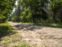 dirt road with trees and grass near dirt surface and wooded area with shadows on trees