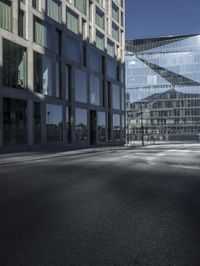 This image captures the modern architecture of a high-rise office building in Berlin, Germany. The glass walls reflect the vibrant city life and showcase the urban design of the bustling business district. The monochrome facade contrasts with the surrounding trees and the hard shadows cast on the road surface. The mixed-use building serves as the headquarters for various businesses and provides public spaces for the metropolitan area. This photo represents the blend of European design, materials, and city living in Berlin.