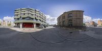 A 360-degree view of Berlin's modern architecture. The curved intersection showcases the city's unique urban design. Two adjacent buildings, featuring a mix of residential and commercial spaces, create a vibrant and bustling neighborhood. A clear sky adds to the city's charm.