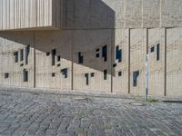 Berlin's urban architecture captured in a modern courtyard. Hard shadows play on cobblestone surfaces in a European city setting. A blend of old and new structures in a bustling cityscape.