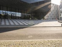 A sunny day in Berlin, Germany. The modern architecture of the Futurium building stands out with its glass walls and metal facade. Two people ride a red bicycle along the city street, creating a dynamic urban scene.