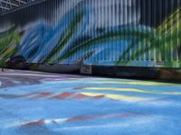 This stock photo showcases the modern architecture of Berlin, Germany. The cityscape features a wide, asphalt road with open space and trees lining the sides. The blue sky overhead provides a clear backdrop for the graffiti murals and street art adorning the walls. In the courtyard, an urban warehouse gallery adds to the vibrant urban design of the city. This image captures the essence of city life and the art district of Berlin, Europe.