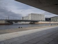 A clear sky over Berlin showcases its modern architecture, with high-rise buildings and urban design. The cityscape is reflected in the water, creating a dynamic city life. The asphalt road surface adds to the urban charm of this European city.