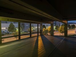 A fish-eye lens captures the empty parking garage in Berlin. Modern architecture and dark lighting create an urban and edgy atmosphere. The open space outside contrasts with the concrete street, showcasing the city's urban design.