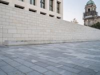 Modern architecture in Berlin with a clear sky backdrop. A man skateboarding adds a touch of city life to the urban design. The empty wall and buildings create a dynamic cityscape.