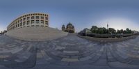 A fish-eye view of Berlin's modern architecture. Tall buildings surround a circular stone area with trees. The clear sky adds to the city's symmetrical profile. A captivating dawn in Europe's urban landscape.