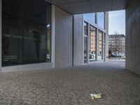 This stock photo showcases the entrance to a modern architecture building in Berlin, Germany. The building's facade is made of concrete and features a composite material flooring. The entrance is clear of any windows or glass doors, giving it a minimalist and sleek look. Onlookers can be seen observing the building from the street. The image captures the urban design and city life of Berlin. The clear sky and grey walls add to the modern and business district atmosphere. Perfect for illustrating architecture, urban design, and office buildings in Europe.
