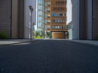 Berlin's modern business district captured in hard shadows and clear skies. Straight down the road, urban architecture and office buildings line the asphalt. A bustling city life scene in Europe's urban design showcase.