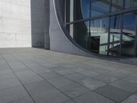 A person walks down a sidewalk in Berlin, Germany, carrying a bag full of belongings. The modern architecture of the city is showcased in the sleek glass walls and concrete facades of the surrounding office buildings. The clean lines and contemporary design create a striking contrast with the urban surroundings. The road surface is paved with limestone tiles, adding to the polished and professional atmosphere of the business district. This image captures the essence of Berlin's thriving business scene and its impressive architectural landscape in the heart of Europe.