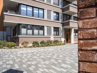 A view of a modern condominium building in Berlin, with clear sky as the backdrop. The urban architecture blends seamlessly with the residential area. The city life thrives in this vibrant European city.