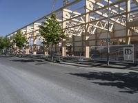 A new building under construction in Berlin's vibrant mixed-use neighborhood. Trees line the road, adding a touch of green to the urban landscape. Clear sky and street lights illuminate the city's architecture.