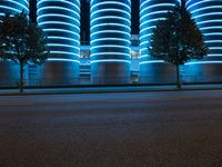 A night scene in Berlin, Germany, showcasing the city's modern architecture and vibrant city life. Neon lights illuminate the metropolitan area, creating a captivating urban design. The city's industrial past is reflected in the dark streets and factories.