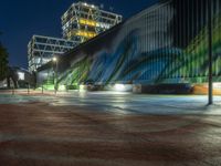 This is an image of a modern architectural building in Berlin, Germany. The city is known for its vibrant art district and graffiti walls, which are reflected in the courtyard of this urban warehouse gallery. At night, the artificial lights illuminate the building, creating a stunning contrast against the dark backdrop of the clear sky. The blue glass and metropolitan area surrounding the building add to the urban design and city life atmosphere. This photo captures the essence of Berlin's modern architecture and its unique artistic expression.