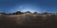 Berlin cityscape at night, with modern architecture and street lights illuminating the urban design. Clear sky above artificial lights, showcasing the break of day. Straight road leading through the city in Europe.
