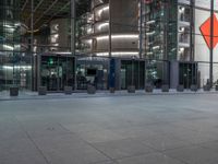 Nighttime in Berlin, showcasing modern urban design and futuristic architecture. Glass walls reflect artificial light, creating a cityscape with open spaces. A blend of dark and light surfaces in a European city.