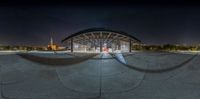 A stunning fisheye view of Berlin's night skyline from a skateboard park. The modern architecture of the city's business and financial districts is illuminated by artificial light. A perfect blend of urban design and city life.