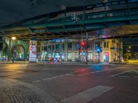 the empty street is filled with people walking and biking under an overpass at night
