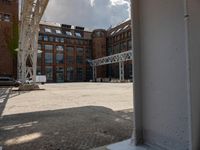 This photo showcases an outdoor courtyard located in the heart of Berlin, Germany. The city's vibrant art district is filled with many large brick buildings, creating a unique urban landscape. The open space, surrounded by warehouses and factories, features a skylight that illuminates the cobblestone surface during the day. This industrial setting provides a captivating backdrop for creative endeavors and is a must-visit destination for art enthusiasts in Europe. The foreground captures the essence of Berlin's thriving urban scene.