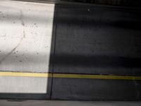 Abstract view of an open parking garage in Berlin, Germany. Yellow stop sign stands next to a concrete wall. Concrete and asphalt floors lead to parking spaces. Hard shadows add an urban touch to the scene.