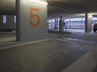 the parking garage is empty with cars in it at night with the number five painted on it