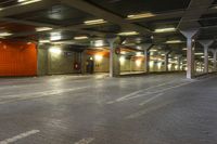Berlin's modern underground parking garage showcases the city's architecture. Multicolored lights illuminate the bricked concrete floors. A vibrant urban space in Europe's bustling capital.