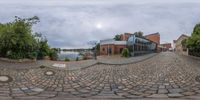 A fisheye view of a cobblestone road in Berlin, Germany. Bikes parked along the road create an open space. Buildings line the road, leading straight down to the coastal area. The pier and harbor can be seen in the distance, with the ocean beyond. A typical European day with clouds overhead.