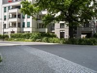 This image captures a view of a cobblestone road lined with modern residential buildings in Berlin, Germany. The road is flanked by a sidewalk and a lush green tree, as well as bushes and other vegetation. The architecture in this residential area is a blend of modern and urban design, showcasing the city life of Berlin. The cobblestone road surface adds a touch of European charm to the overall scene. With its mix of urban fixtures and natural elements, this photo represents the unique combination of architecture and nature in Berlin.
