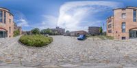 A classic Berlin street with cobblestone road and parked cars. The fish lens perspective captures the architectural beauty of the buildings. The clear sky adds to the charm of this European city.