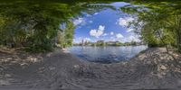a fish eye view of a small pond on the shore of a lake with no waves