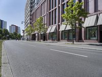 This image captures the modern architecture and city life of Berlin, Germany. The photo shows a wide road with low-rise buildings on either side. The clear sky above highlights the awnings and storefronts of the shops that line the street. This residential area reflects the urban design and metropolitan atmosphere of the city. Berlin is known for its vibrant neighborhoods and diverse property options. The photo represents a typical day in this European city.