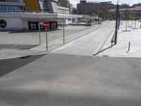 This is an image of an empty street in Berlin, Germany. The modern architecture and urban design are prominent in the high-rise buildings and elevated road. The road surface is made of smooth asphalt, and parking spaces are available along the curb. The residential areas and green trees create a peaceful neighborhood atmosphere. This photo represents a typical day in the city, capturing the essence of city life in Europe.