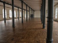 A classic Berlin residential interior with stunning architecture. The floor is made of composite wood and glass, providing a modern touch. The warehouse-like hall features high ceilings and beams, perfect for an interior design project or real estate development. The space is filled with natural light, creating a beautiful and inviting atmosphere.