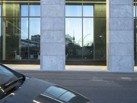 This image captures the modern architecture of an office building in Berlin, Germany. The blue dawn sky reflects off the glass facade, creating a stunning reflection. The building's profile stands out against the urban landscape of the business district. The sleek design of the building, along with the asphalt road and parked vehicles, conveys a sense of automotive exterior and automotive design. This photo represents the dynamic and innovative nature of Berlin's business and architecture scene.