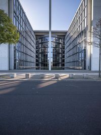This image showcases the modern architecture in Berlin, Germany. The photo captures a busy city street with a mix of residential and corporate buildings. The sleek facades and structures create interesting profiles and shadows in the metropolitan area. The reflection in the glass windows adds to the urban feel of the scene. The photo represents the vibrant and dynamic nature of the city, with its mix of residential and commercial spaces. This is a perfect visual for showcasing Berlin's modern architecture and its status as a major European metropolitan area.