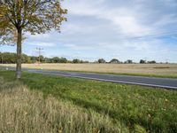 This stock photo depicts a scenic road in Berlin, Germany, surrounded by a stunning autumn landscape. The asphalt road stretches towards the horizon, passing through fields filled with lush green grass and vibrant vegetation. The clear sky above adds to the beauty of this rural scene. The image captures the peacefulness and tranquility of the countryside, making it a perfect representation of nature and serenity in Europe.