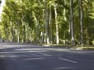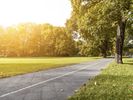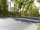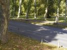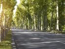 A straight road in Berlin, lined with trees and surrounded by a lush forest. The autumn sunlight casts long shadows on the high grass and yellow leaves. A picturesque landscape in a suburban park.