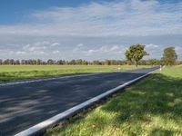 This image captures a rural road in Berlin, Germany. The road surface, made of asphalt, is empty, surrounded by lush green grass and trees. The clear blue sky above enhances the natural beauty of the landscape. The photo represents a peaceful autumn day in the European countryside. It showcases the harmonious coexistence of nature and human infrastructure. The vibrant green vegetation and the well-maintained road reflect the agricultural and rural charm of Germany. This photo perfectly depicts the serene and picturesque nature of Berlin.