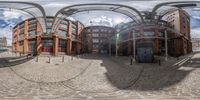 A vibrant street in Berlin's shopping district, with red brick buildings lining the road. The fisheye lens gives a unique perspective of the bustling city. The perfect mix of architecture, design, and urban life.
