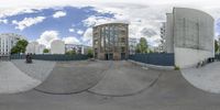 A skate park in Berlin with tall buildings as a backdrop. The fish-eye lens captures the energy of skateboarders riding the ramp. The modern architecture and clear sky create a vibrant city scene.