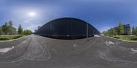 Skateboarder glides along the streets of Berlin, showcasing the city's modern architecture. Empty building in a residential neighborhood adds a sense of urban exploration. Clear skies invite a day of skateboarding.