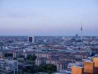 This stunning panoramic image captures the beautiful cityscape of Berlin, Germany. Taken from atop the iconic Eiffel Tower at dusk, the photo showcases the metropolitan area's high-rise buildings and bustling urban life. The horizon glows with the warm hues of sunset, creating a breathtaking scene. In the skies above, contrails trace the paths of airplanes, reminding us of the city's connectivity to the rest of Europe. Berlin, known for its rich history and vibrant culture, is a must-visit destination for any traveler. The image specifically focuses on the famous Potsdamer Platz, a symbol of Berlin's rebirth and modernity. Enjoy the elevated view of this dynamic German metropolis.